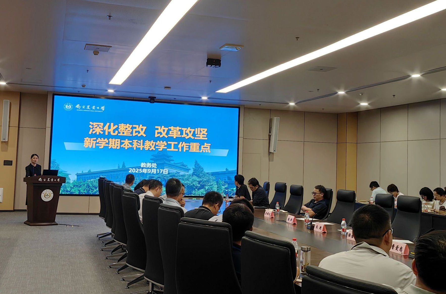 9月17日下午,南京农业大学2025-2026学年第一学期本科教学工作会议在滨江校区会议中心召开。副校长朱艳出席并讲话,教务处领导班子、各学院教学副院长、教学秘书及教务处各科室工作人员参加。会议由教务处处长曹爱忠主持。